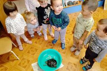 В нашем саду появилась морская черепаха, зовут его Яша.Дети первой младшей группыпришли с ним познакомится, понаблюдать как он принимает пищу. Дети были в восторге!!!