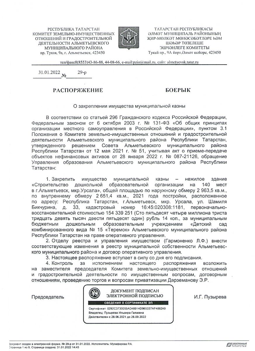 Распоряжение о закреплении имущества муниципальной казны (корпус "Русалочка")