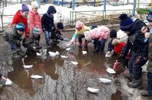 Неожиданно быстро и стремительно наступила весна! Мы и оглянуться не успели, а уже тепло и хорошо. Такое чувство, что мы попали в сказку "12 месяцев". Холод сменяется теплом - только что лежал снег, вот ручейки побежали. Настало самое время для запускания корабликов. Вот этой весенней забавой решили сегодня заняться дети старшей группы №2 во главе с воспитателем Крыловой И.З.. Для небольшой лужи и ручейков сделали совсем крошечные кораблики и заодно еще и легкие развивали - дули на кораблики, гоняя их от края к краю лужи. А еще "заморочились" над созданием корабля! Малышам этот процесс тоже очень понравился.
