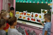 Занятие "Обучение грамоте".Подготовительная логопедическая группа #4 "Колокольчик" "Покажите фрукты, которые начинаются с гласного звука". ". Вот они: авокадо, апельсин, абрикос".