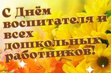 С Днем воспитателя и всех дошкольных работников! От души желаю здоровья и мира, достатка и радости. Пусть каждый день дает возможность чувствовать себя счастливым человеком. Пусть озорные дети дарят яркие улыбки и посвящают в свои веселые тайны. Пусть работа всегда остается любимым занятием. Пусть жизнь всегда будет полна чудес и вдохновения!