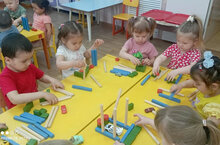 Цель: Обучать детей умению выполнять постройку гаража посредством показа. Учить различать цвета и формы деталей (кубик, кирпичик, цилиндр, квадрат, прямоугольник) в процессе создания простейших построек.