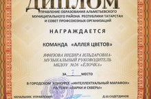 Команда "аллея цветов" награждена дипломом за 1 место в Городском конкурсе "Интеллектуальный марафон" на тему "Парки и скверы", музыкальный руководитель Яфизова ИИ и воспитатель Смолькина АФ