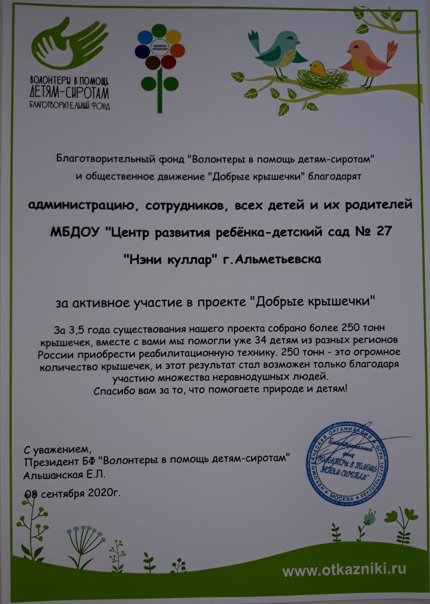 • Муниципальное бюджетное дошкольное образовательное учреждение «Центр развития ребенка - детский сад №27 «Нэни куллар» г. Альметьевска/Әлмәт шәһәренең "Баланың сәләтен үстерү үзәге 27-нче "Нэни куллар" балалар бакчасы» муниципаль бюджет мәктәпкәчә белем бирү учреждениесе
