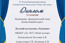 Детский коллектив "Ладушки" (ребята из групп 13,7,8,12) МБДОУ "Д/с #27"Нэни куллар" принял участие в IV Республиканском конкурсе сценического искусства "Театр как театр" с постановками "Путешествие Божьей коровки" и "Щелкунчик" и стал обладателем дипломов 1 и 2 степени в номинациях "Драматический театр" и "Мюзикл"! -