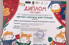 Подготовительная к школе группа №5 награждена дипломом "Участника"в номинации "Увлеченные и вовлеченные дети","Режиссерско-педагогическая работа с детьми", "Самостоятельность детей во время спектакля" в фестивале театрального творчества детей дошкольных образовательных учреждений Альметьевского муниципального района
