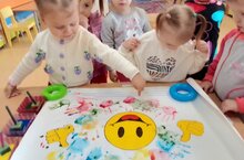 В режимных моментах группы младшего возраста "Капитошка" прошёл День солнечных улыбок. Ребята приветствовали веселого, улыбчивого смайлика и украшали его цветными ладошками.
