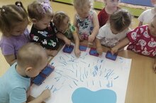 Очень необычный "День дождя" прошёл в группе младшего возраста "Капитошка". Детки весело танцевали и рисовали ватными палочками дождик. -
