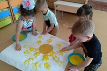 "День Солнца" во 2 младшей группе "Дружба". Рисование солнечных лучиков нетрадиционным методом (ладошками).