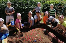 Игры на песке – одна из форм естественной деятельности ребёнка. Именно поэтому, мы взрослые, можем использовать песочницу в развивающих и обучающих целях, придумывая истории, описывая то, что создали дети своими руками. В нашем детском саду дети с удовольствием делают разные постройки из песка. Так, например дети подготовительной группы слепили большую ящерицу и украсили ее разноцветными крышками.Юркнет ящерица вдругВ щелку между камнямиЯ об этом расскажуПо секрету маме. -