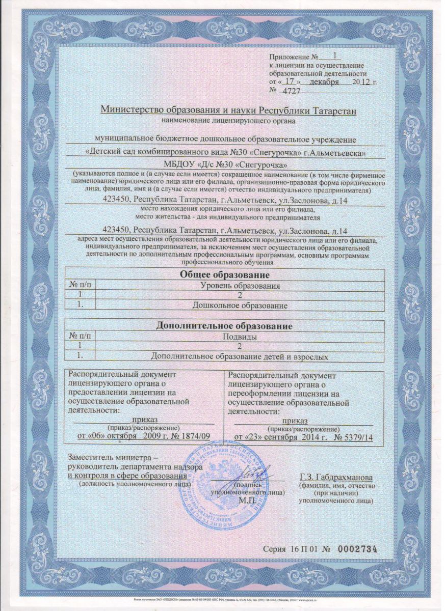 1. Программа дошкольного образования "Основная образовательная программа " муниципального бюджетного дошкольного образовательного учреждения "Детский сад комбинированного вида № 30 "Снегурочка", Альметьевского муниципального района Республики Татарстан