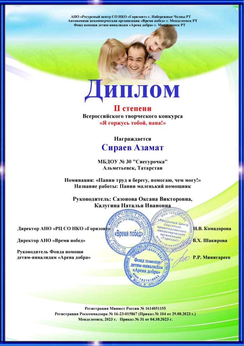 Пащенко Риназ диплом 2 степени УО АМР РТ МБУДО "ЦДЮТ" Общественное объединение "Совет отцов АМР" IIрегиональный конкурс семейного творчества "Аты - баты" посвященный Дню защитника Отечества, "Подарок папе"