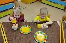 Сегодня ребята первой младшей группы, пригласили Матрёшку в гости. А для этого, они построили, по образцу воспитателя стол и стол. Продолжили, рассматривать детали постройки. Познакомились, что кубик может быть деревянным и пластмассовым. Вот, такие, молодцы.