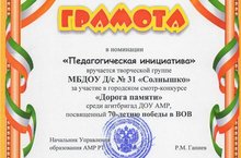 Поздравляем творческую группу МБДОУ "Д/с № 31 "Солнышко" с вручением грамоты в номинации "Педагогическая инициатива" за участие в смотр-конкурсе "Дорога памяти" среди агитбригад ДОУ АМР, посвящённом 70-летию победы в ВОВ.