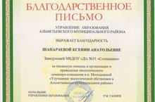 Поздравляем коллектив нашего детского сада с получением Благодарственного письма Управления образования Альметьевского муниципального района за оказанную помощь в организации и проведении экологического семинара- совещания в п. Молодёжный "Улучшение экологической обстановки в Альметьевском муниципальном районе"