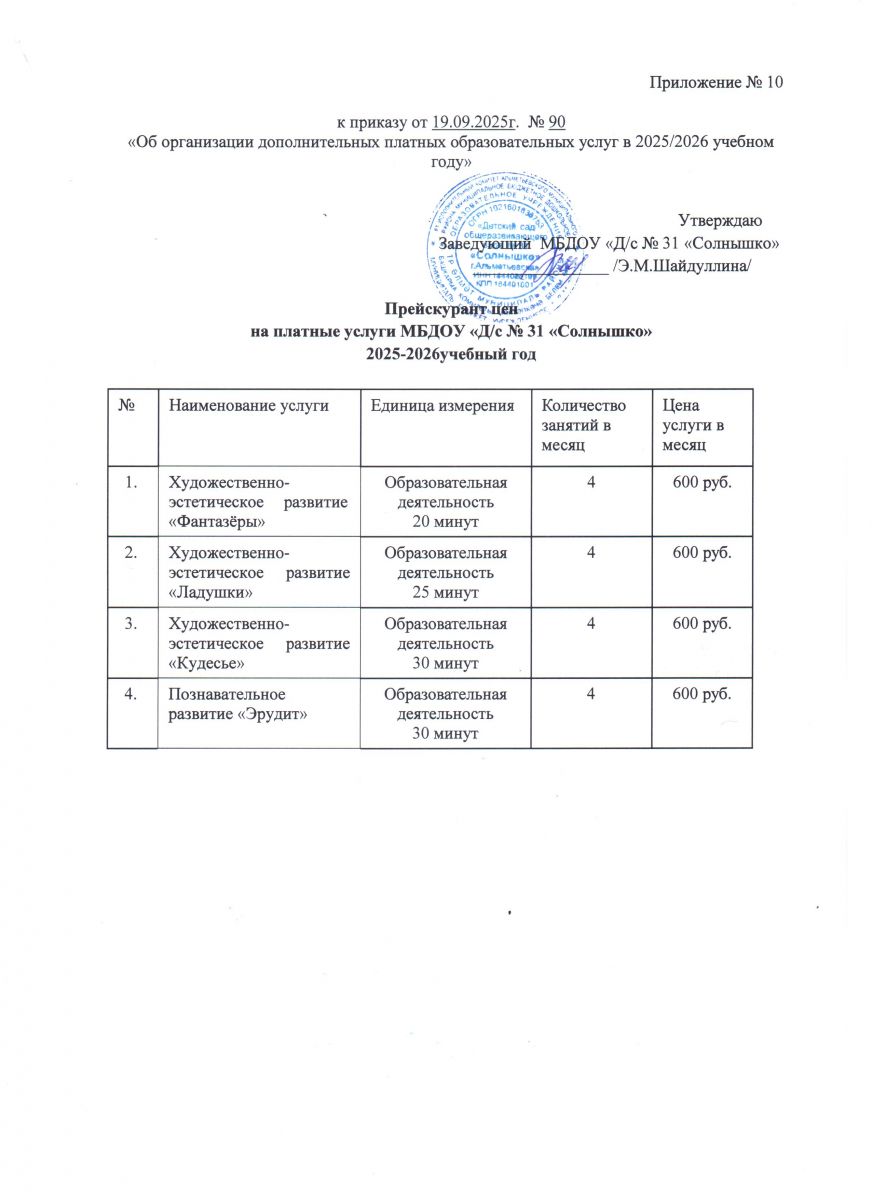 Документ о стоимости дополнительных платных образовательных услугах - Прейскурант цен на 2025-2026 учебный год