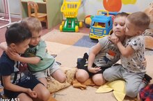 Подготовительная группа "Котята" и педагог психолог Митяева Анастасия Николаевна, зашли в гости , к маленьким друзьям. Ребята познакомились с Зайцем, Медведем и Кошкой . звери показали дружбу и заботу друг о друге , и этому научили младших друзей. -