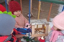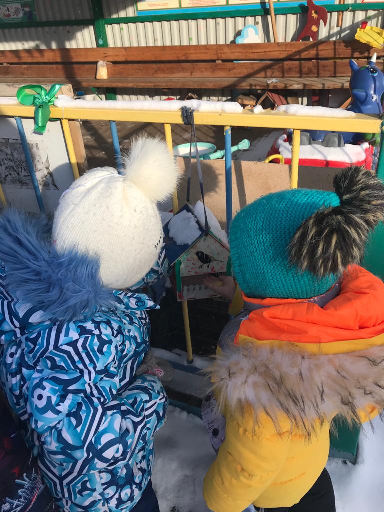 Чтобы помочь птицам, воспитанники группы «Зайчики» создали на участке «Птичью столовую» для зимующих птиц. Для этого родители оказали помощь в изготовление кормушек. Ребята принесли корм для пернатых друзей. Таким образом у дошколят закрепляется представление о зимующих птиц, воспитывается интерес и любовь к природе родного края, а также стремление беречь птиц и помогать им в зимний период.