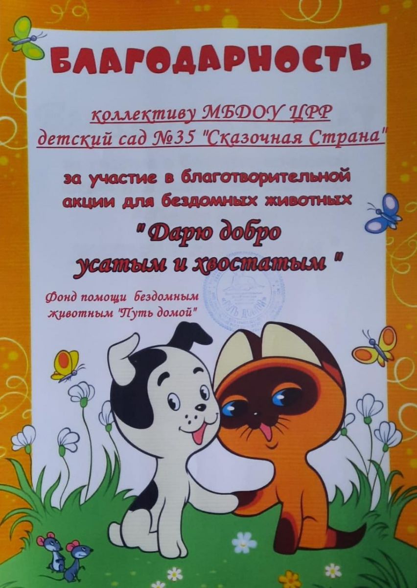 Группа "Веселые ребята "совместно с родителями, организовали акцию для бездомных животных фонда "Путь домой". В акции приняли участие весь коллектив детского сада, группы, родители. Благотворительная акция направлена на то, что в нашем городе очень большое количество бездомных кошек и собак. Животные нуждаются в помощи и уходе. Они голодают и замерзают. Именно поэтому мы решили приучать наших детей к соучастию и взаимопомощи, и организовали в детском саду акцию "Дарю добро, хвостатым и усатым". Заранее были оговорённы правила присутствия в фонде,провели беседы про животных,организовали выставку рисунков, просмотр поучительных фильмов. Формирование заботливого и бережного отношения к животным имеет большое значение в жизни ребенка. Вовлекая ребенка в совместную деятельность по уходу за питомцами, взрослые развивают в нем чуткость, умение понимать другую жизнь, побуждают к сочувствию, воспитывают готовность помочь делом и заботу.