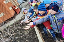 "Рассмотрение почек на ветках" на прогулке ,группа Веселые ребята,с воспитателем Митяевой А.Н. рассматривали почки на кустарниках и вишнях.цель прогулки и беседы :