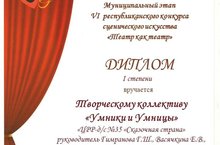 Воспитанники нашего детского сада приняли участие в муниципальном этапе VI республиканского конкурса сценического искусства «Театр как театр» в постановке мюзикла «Стрекоза и муравей» (руководители Гимранова Г.Ш., Васячкина Е.В., Гатауллина А.А.). Получили заслуженные награды: Диплом 1 степени в номинации «Мюзикл» и Диплом в номинации «Лучшее исполнение главной роли». Поздравляем!