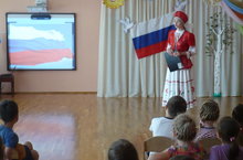 Накануне Дня России в нашем детском саду прошло праздничное мероприятие, посвященное этому событию. Целью мероприятия стало воспитание любви и гордости к своей стране, уважение к традициям своего народа. Дети познакомились с гербом, флагом, гимном России, русскими народными праздниками, играми. Ребята танцевали, водили хороводы, играли в подвижные и музыкальные игры, соревновались, побеждая во славу России. А в группах старшего дошкольного возраста дети смотрели презентацию "Моя Россия".