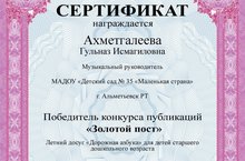 Поздравляем музыкального руководителя Ахметгалееву Г.И. с победой в конкурсе публикаций «Золотой пост» на международном образовательном портале MAAM.RU