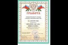 Поздравляем воспитателя Фролову Аксану Николаевну – автора стихотворения «Школа безопасности». Она отмечена грамотой управления образования за авторство и участие ее воспитанницы – Мельниковой Дарьи в конкурсе чтецов «Дорога безопасности» среди воспитанников дошкольных образовательных учреждений Альметьевского муниципального района.