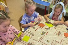 Балалар турыпочмаклыкларның почмакларын кисеп, композиция төзеделәр, пөхтә итеп сурәтләр ябыштырдылар. -