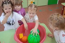 Ребятишки младшей группы "Цыплята"в ходе игры- опыта с удовольствием познакомились с тем, какие предметы плавают в воде, какие нет. Из какого материала они сделали. Очень детям понравились игры с водой.