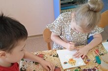 Дети старшей группы "Солнышко"нарисовали маленького жирафа, который решил подарить цветок своей любимой маме, так как скоро весна, праздник. Ребята кроме акварельных красок использовали пластилин, из которого получился яркий цветок, также вату для украшения облаков.