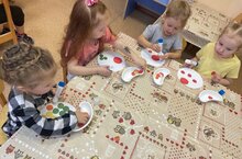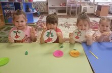 В группе зайчики провели аппликацию на тему «Ягоды и яблоки лежат на блюдечке»