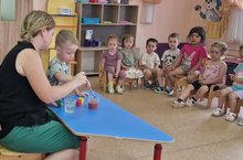 В 1 мл группе «Кроха» закрепили представления о свойствах воды.Вода, как известно, обладает рядом уникальных свойств, о которых ребенку будет интересно узнать. Конечно, в обычной жизни малыш часто взаимодействует с водой и поэтому сам уже давно интуитивно понял, что она не имеет ни формы, ни вкуса. Однако такие опыты все-таки нужны для того, чтобы акцентировать внимание ребенка на этих свойствах и показать, что вода – это уникальное вещество. Набрали тёплую воду и смотрели как губка впитывает воду ,запускали кораблики .Далее в таз с теплой водой налили жидкое мыло ,затем венчиком взбивали .Когда появилась пена предложили детям потрогать ,поиграть ,подуть . Воспитатель Мовламова Д.З.