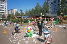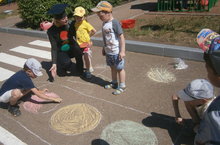 Сегодня к детям «Волшебного дворца» приходил в гости сам Светофор-светофорович. Он беседовал с детьми о светофоре, закрепил знания о значении красного, желтого, зеленого цветов светофора. Малышей наш друг Светофор учил, как правильно переходить улицу. Старших детей учил правилам езды на велосипедах и самокатах, а затем устроил веселые соревнования на велосипедах… На память дети нарисовали на асфальте большой светофор.