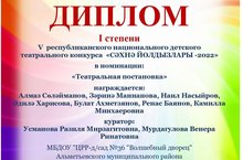 Поздравляем наших педагогов Усманову Разилю Мирзагитовну, Мурдагулову Венеру Ринатовну и детский коллектив с победой в V Республиканском национальном детскои театральном конкурсе "Сәхнә йолдызлары - 2022"!