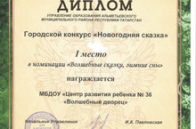 По итогам проведения городского конкурса "Новогодняя сказка" на лучшее новогоднее оформление зданий и территорий, фойе дошкольных образовательных учреждений Альметьевского муниципального района к новому 2020 году наш детский сад стал победителем в номинации "Волшебные сказки, зимние сны" и награжден дипломом I степени! В номинации "Новогодний серпантин" наше дошкольное учреждение награждено дипломом II степени. Приятно получать достойную награду за старания наших педагогов и родителей! Участвуя в этом конкурсе, в фойе сада были организованы интересные сказочные новогодние фотозоны, которые пользовались успехом среди родителей и детей. Каждый ребенок и взрослый мог окунуться в сказку и запечатлеть это на память. Фассад здания был оформлен символами Нового года.