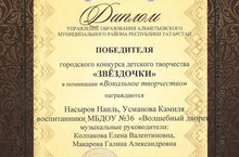 В феврале прошел ежегодный городской конкурс детского творчества «Звездочки – 2018» среди дошкольных образовательных учреждений Альметьевского муниципального района. Музыкальные руководители нашего сада Колпакова Е.В. и Макарова Г.А. подготовили с детьми Насыровым Камилем и Усмановой Камилей номер в номинации «Вокальное творчество» и стали победителями. Украшением дуэта стала танцевальная постановка с участием старших и подготовительных групп. От всей души поздравляем детей и педагогов, желаем дальнейших творческих успехов и побед!