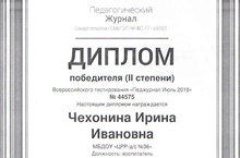 Диплом победителя (II степени) Всероссийского тестирования "Педжурнал Июль 2016" в направлении:"Использование информационно-коммуникационных технологий в педагогической деятельности" получила воспитатель Чехонина И.И.