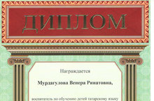 Дипломом за активную работу в организации выставки детских рисунков, посвящённой 130-летию со дня рождения Г.Тукая "Тукай в театре" награждены воспитатели по обучению детей татарскому языку Мурдагулова Р.М. и Мурдагулова В.Р., благодарственные письма получили дети: Шайдуллин Руслан, Хабибуллина Исламия (руководители Шарипова Г.Д., Гимранова Р.Р.), Хазиева Ралина (Кузнецова Т.Г.), Мальцева Полина (Кашина Р.А.), Шайдуллина Риана (Чентаева), Султанова Айлина, Шаяхметова Сюмбель, Гусманов Тимур, Гусманова Карина (Зеленцова Л.А., Костромина М.А.), Шарипов Рамазан (Чехонина И.И., Керимова Н.С.), Вафина Амелия (Самойлова Р.Ш.), Сагдеев Радмир (Гиниятова Г.Ф.), Гуляева Василиса (Максимова Т.А.). Дипломы II степени за участие в конкурсе чтецов "Шигүри чишмә" получили Шарипов Рамазан, Шакиров Азамат, Садриев Сабир, Камиль Ахметшин. Молодцы!