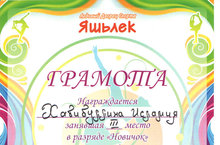 Воспитанница группы "Росток" Закирова Назиля награждена дипломом за III место в городском интеллектуальном конкурсе "Самый умный дошколёнок". Молодец!Поздравляем! Благодарим родителей Назили и воспитателя Самойлову Р.Ш. за подготовку к конкурсу.