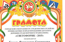 Грамоту городского смотра - конкурса среди воспитателей по профилактике и предупреждению дорожно- транспортного травматизма "Светофорик - 2015" в номинации "Артистичность и творчество" получила воспитатель Гиниятова Гузель Фаридовна, выступившая в роли Мери Поппинс на мастер - классе с детьми МБДОУ "Центр развития ребёнка - детский сад №1 "Бэлэкэч". Молодец! Поздравляем!