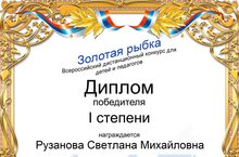 Диплом победителя I степени Всероссийского дистанционного конкурса для детей и педагогов "Золотая рыбка" получила учитель-логопед Рузанова Светлана Михайловна в номинации "Творческие педагогические работы" за дидактическую игру "Наряди Золушку". Молодец! Поздравляем!