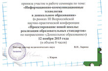 Музыкальные руководители Колпакова Елена Валентиновна и Макарова Галина Александровна, воспитатели по обучению детей татарскому языку Усманова Разиля Мирзагитовна и Мурдагулова Венера Ринатовна приняли участие в работе семинара по теме: "Информационно-коммуникационные технологии в дошкольном образовании" (в рамках III Всероссийской научно-практической конференции "Проектирование новой школы:реализация образовательных стандартов" по направлению "Дошкольное образование"). Молодцы!