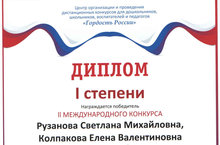 Поздравляем победителей II международного конкурса, организованного Центром организации и проведения дистанционных конкурсов для дошкольников, школьников, воспитателей и педагогов «Гордость России», учителя-логопеда Рузанову С.М. и музыкального руководителя Колпакову Е.В. Они заняли I место в номинации «Сценарии праздников и развлечений в ДОУ» за работу «С добрыми стихами, песней, сказкой – жизнь становится прекрасней». Молодцы!
