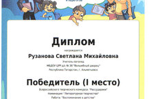 Поздравляем учителя – логопеда Рузанову Светлану Михайловну с победой во Всероссийском творческом конкурсе «Рассударики», в номинации «Литературное творчество», работа «Воспоминание о детстве». Молодец!