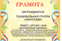 Поздравляем танцевальную группу «Фантазия» за участие в городском конкурсе детского творчества «Звёздочки» среди воспитанников дошкольных образовательных учреждений АМР. Благодарим ребят и музыкальных руководителей: Колпакову Е.В., Макарову Г.А., заведующую Гудакову Т.Т.. Молодцы!