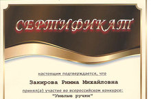 Сертификат участника во всероссийском конкурсе «Умелые ручки» получила воспитатель Закирова Римма Михайловна. Молодец!
