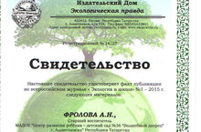 Свидетельство, удостоверяющее факт публикации во всероссийском журнале «Экология в школе» №1 -2015 г. получила Фролова А.Н. Читайте её «Экологические сказки для самых маленьких».