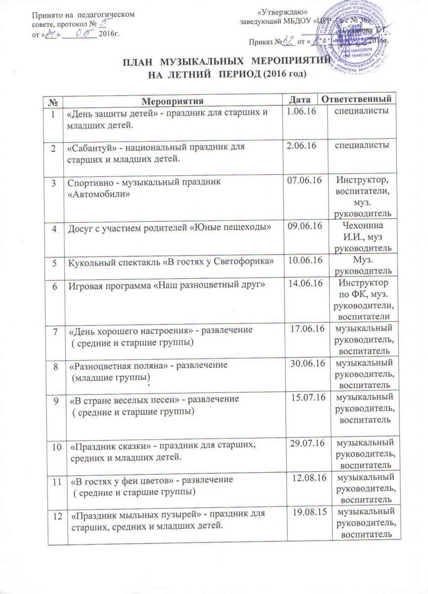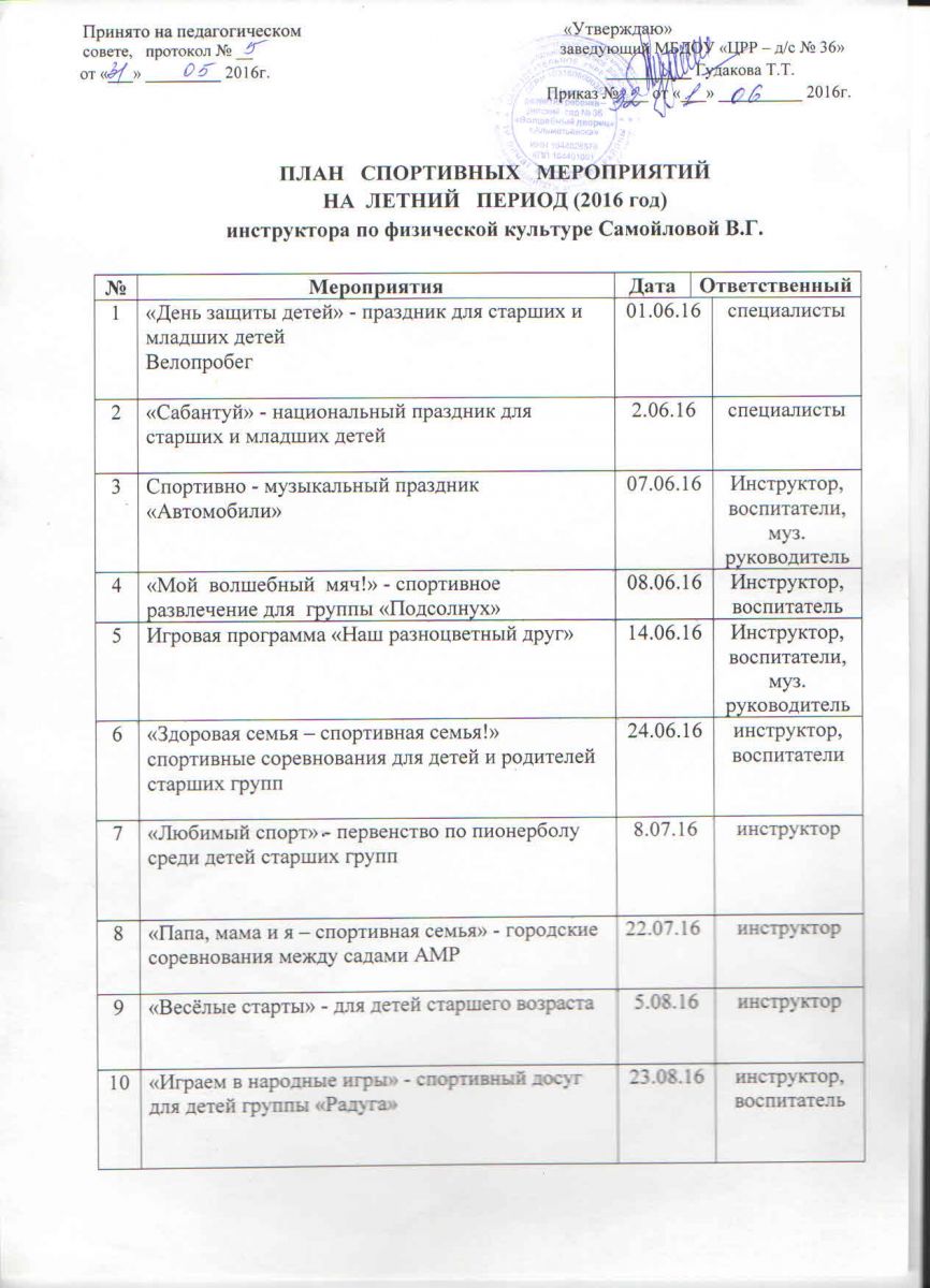 План летней образовательной работы на 2016 год МБДОУ "ЦРР - д/с №36 "Волшебный дворец"
