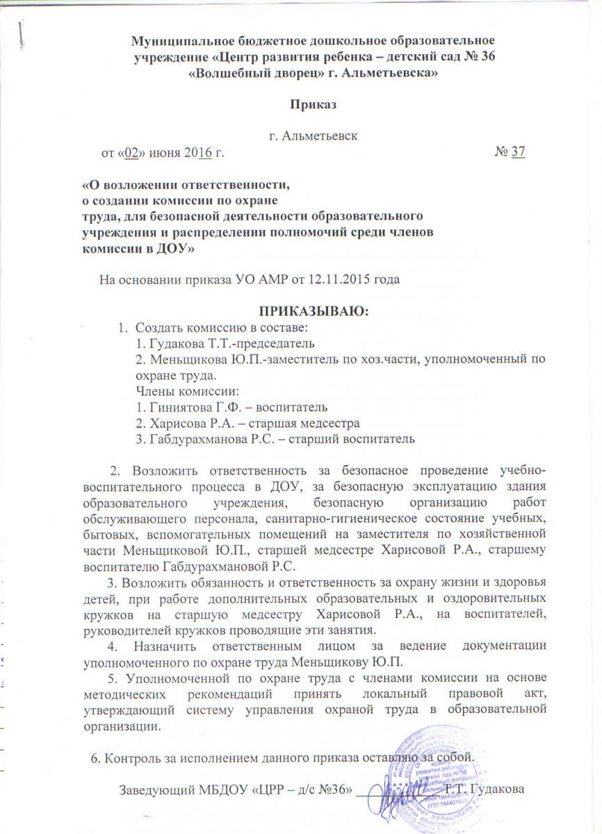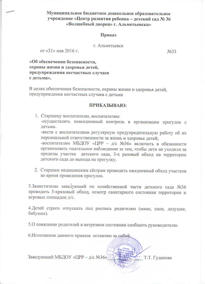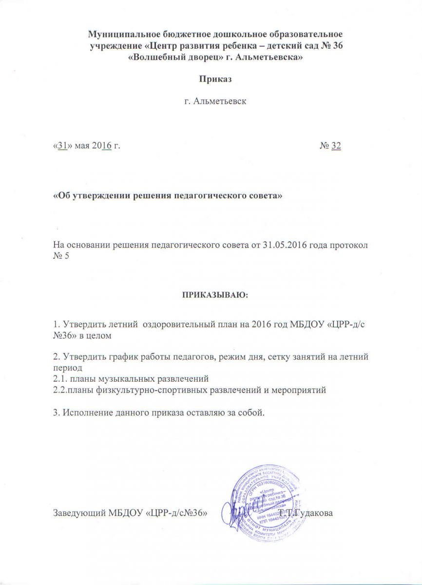 Приказ "О летней оздоровительной работе МБДОУ "ЦРР - д/с №36 "Волшебный дворец"